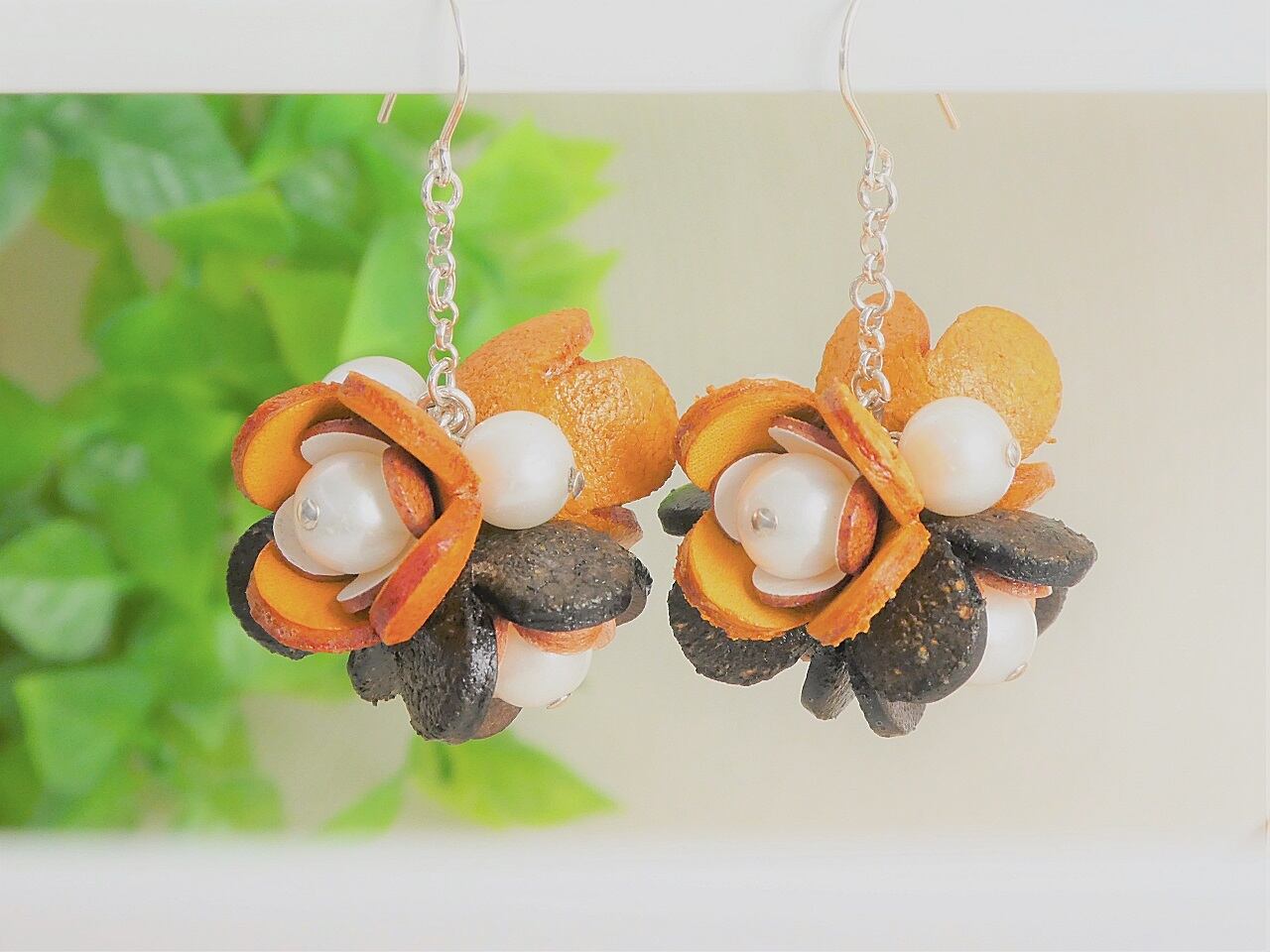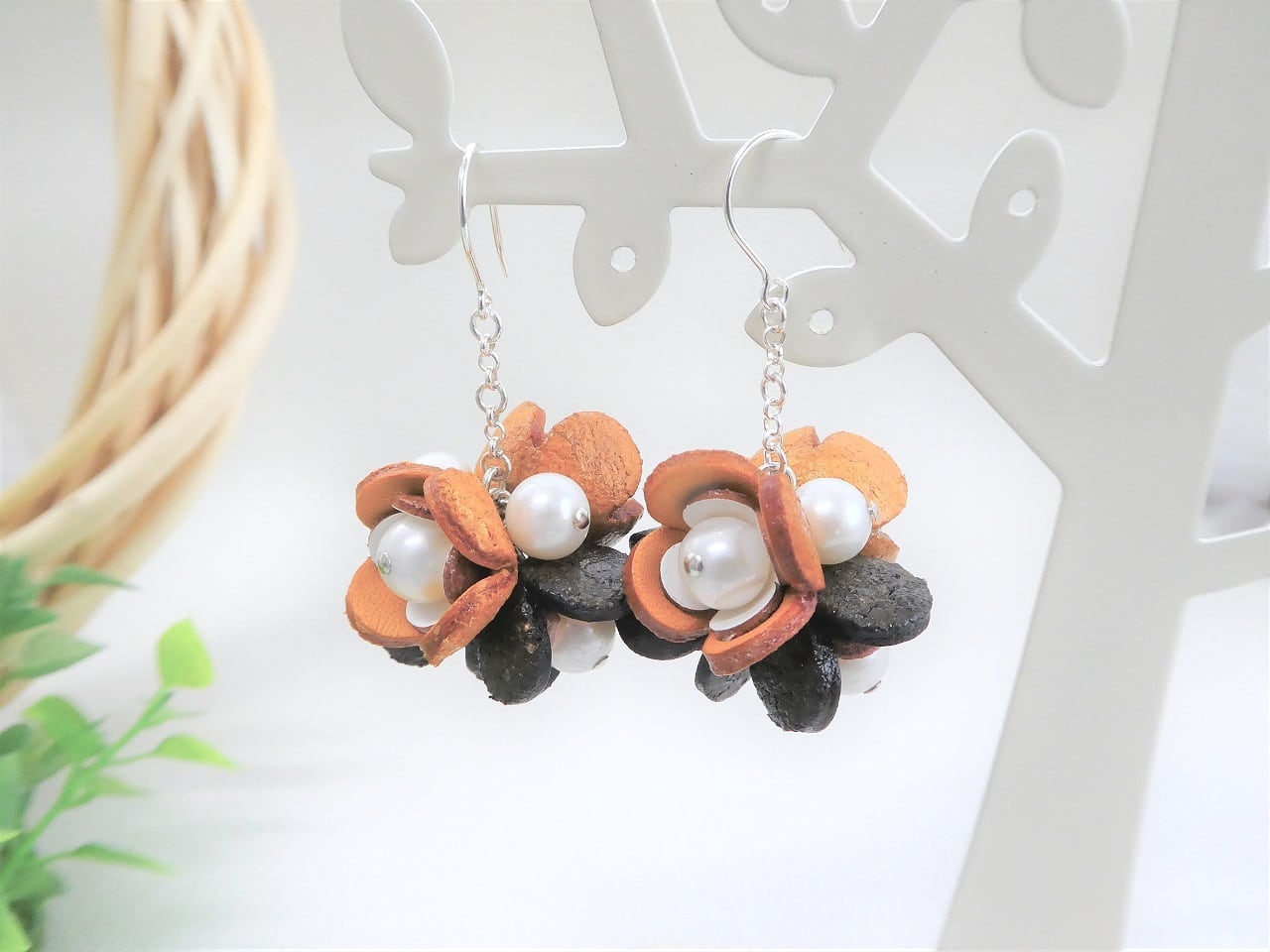 淡水パールとレザーのフラワーボール ピアスorイヤリング