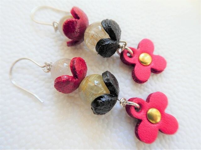 天然石(ルチルクォーツ)をフラワー型のレザーに乗せIラインで並べました。